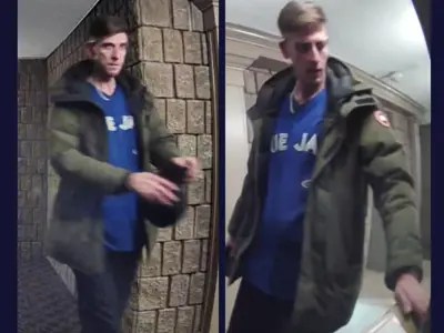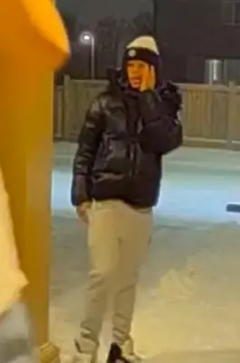 Security video captured an image of a person of interest. He was described as a white male in his mid-20s to mid-30s, tall and thin with short brown hair. He was wearing a green winter jacket over a Toronto Blue Jays jersey, dark pants and black Nike running shoes.